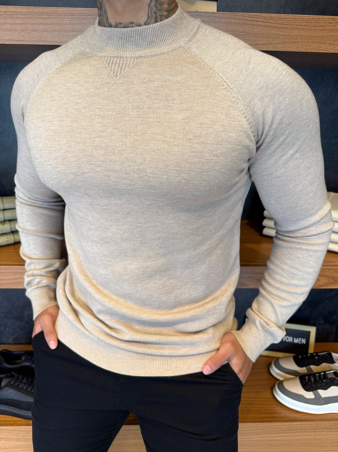 Classic Knit Mid-Neck Jumper – Beige Marl